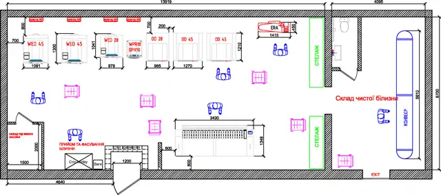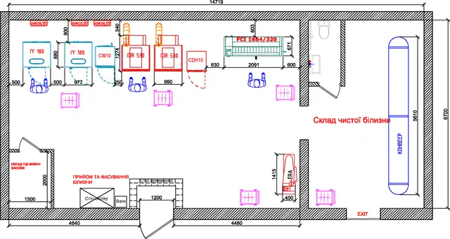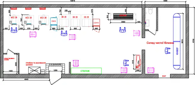 Велика пральня, яка здатна обробляти більш як тонну білизни за робочу зміну. Завантаження машин від 10 до 50 кг дозволить легко уникнути перетину потоків білизни різних клієнтів.