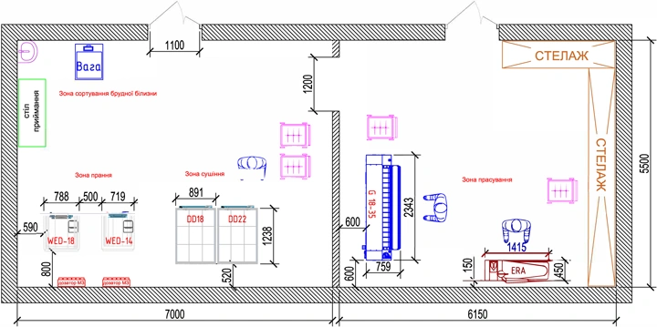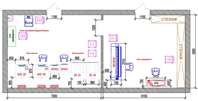 3-4 працівники повинні впоратися з сортуванням білизни, пранням, сушінням та прасуванням. Для прасування прямої білизни слід використовувати прасувальний каландр із хромованим валом та шириною робочої поверхні від 2 метрів.