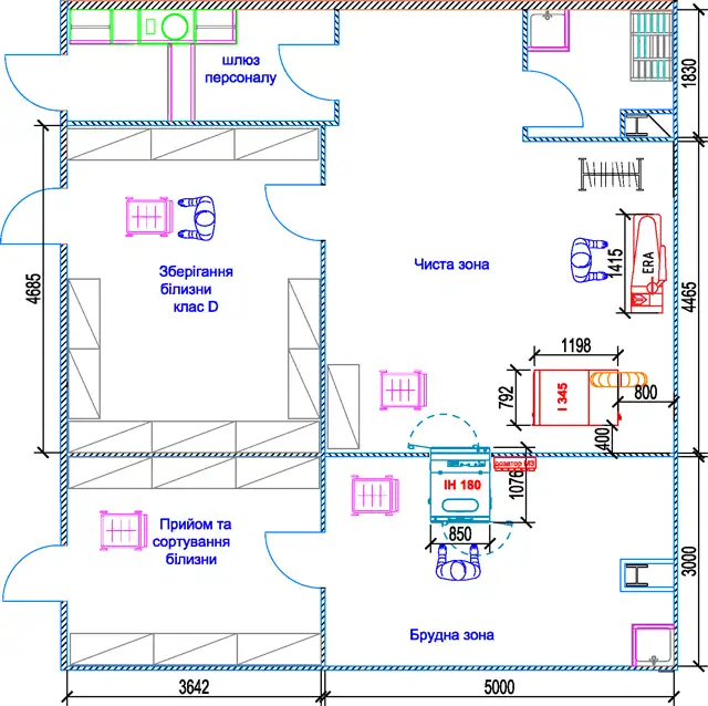 Мінімальна комплектація із бар’єрною пральною машиною IPSO IH180 завантаженням 18 кг. Як альтернативу, можна використовувати модель DANUBE MED-16 завантаженням 16 кг.