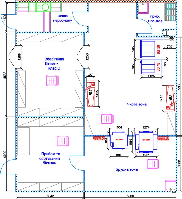Пральня повинна мати “брудну” зону, де відбувається збирання та зберігання брудного одягу, сортування та завантаження уніформи в пральну машину. У сусідньому приміщенні має бути “чиста” зона, де відбувається вивантаження з пральної машини, сушіння та прасування. Подальше зберігання чистої уніформи також знаходиться у “чистій” зоні, таким чином потоки брудного та чистого одягу не перетинаються.